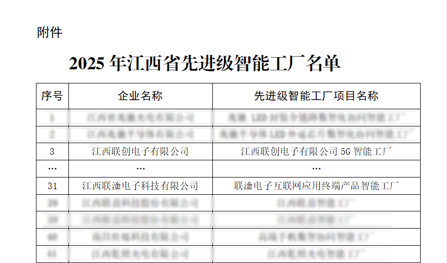 近日,江西省工业和信息化厅正式公布2025年江西省“先进级智能工厂”名单,186家企业入选。其中KY电竞·(中国)官方网站,、江西联淦电子科技有限公司2家联创电子系企业名列榜单。这标志着公司在智能制造领域的创新成果再次获得政府权威认可。